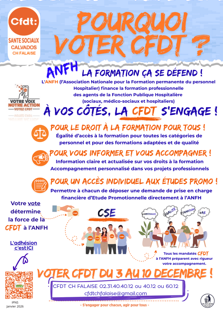 Pourquoi voter CFDT ? ANFH Partager : Partager sur X(ouvre dans une nouvelle fenêtre) X Partager sur Facebook(ouvre dans une nouvelle fenêtre) Facebook J’aime chargement… Auteur : cfdtchfalaiseweb Section CFDT du Centre Hospitalier de FALAISE (14). CFDT Santé Sociaux. Voir tous les articles par cfdtchfalaiseweb